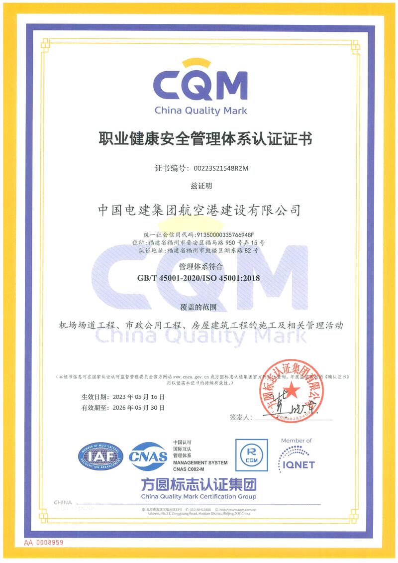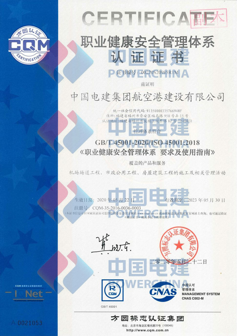 中国电建集团航空港建设有限公司职业健康安全管理体系认证证书副本