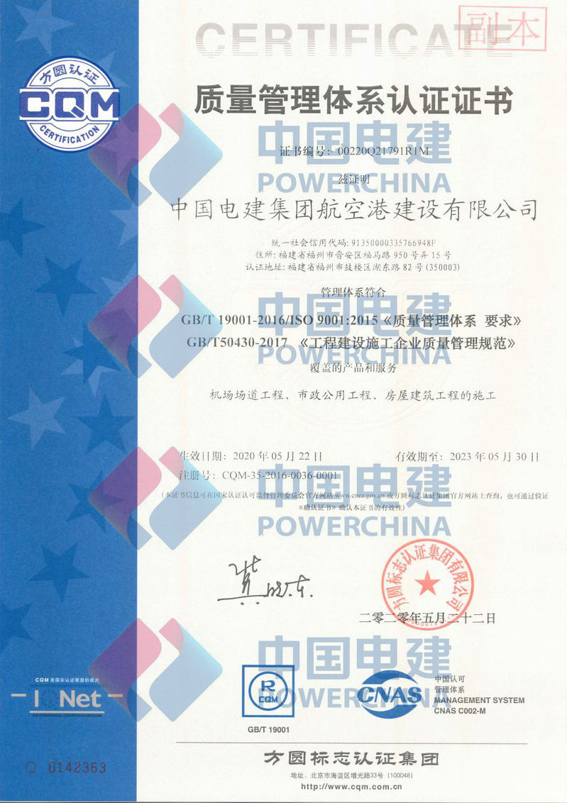 中国电建集团航空港建设有限公司质量管理体系认证证书副本