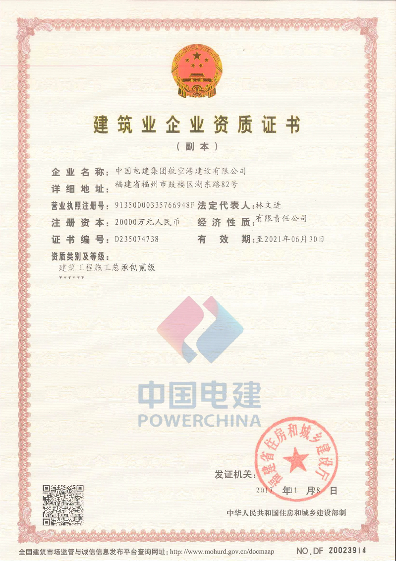 中国电建集团航空港建设有限公司建筑工程施工资质证书副本